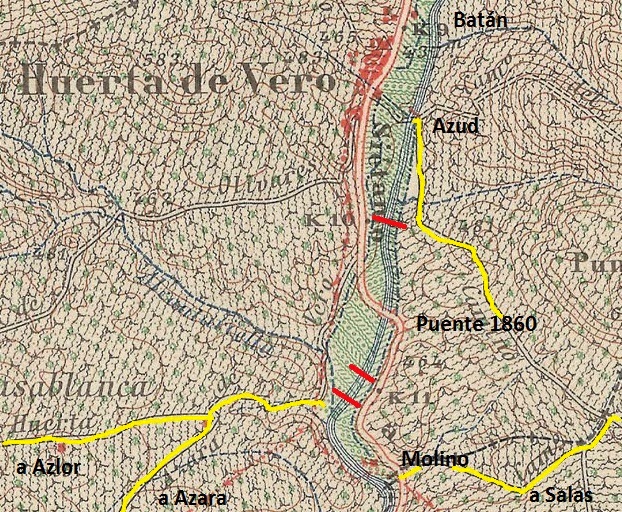 Bajando junto al río a 300 metros nos encontramos restos del Puente de Algar. Este puente servía para cruzar el camino que iba de Azara y Azlor a Salas.