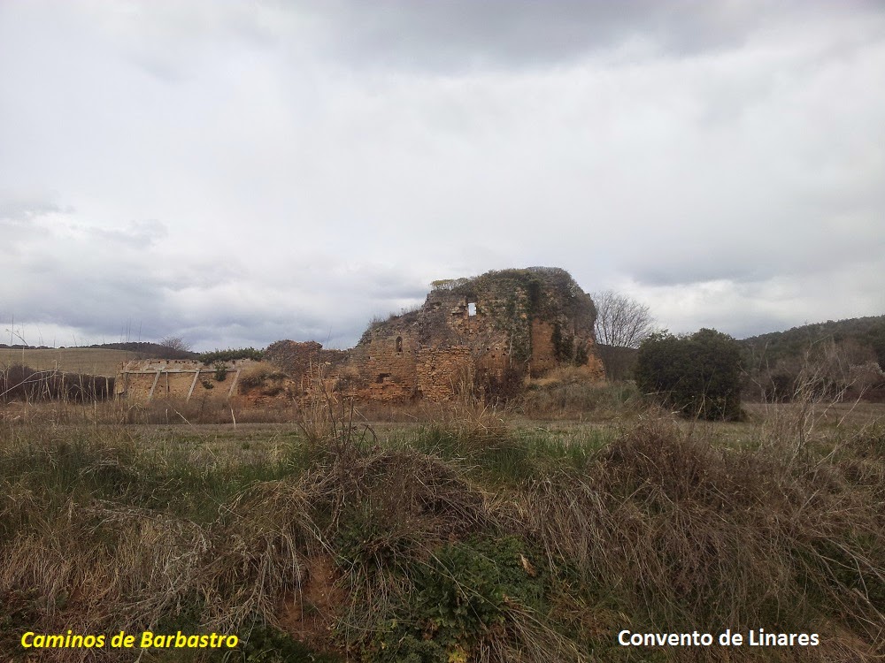 A pocos metros de esta confluencia de caminos, vemos a nuestra derecha las ruinas del antiguo convento dominico de Nuestra Señora de Linares, sobre el que escribí un artículoen estas mismas páginas hace ya varios años. Fue construido en 1413 y llegó a ser panteón de los condes de Ribagorza. Se expropió en el siglo XIX con motivo de la desamortización. Una interesante lápida procedente de este convento se guarda en el pequeño museo parroquial de Benabarre.
