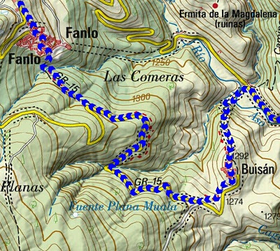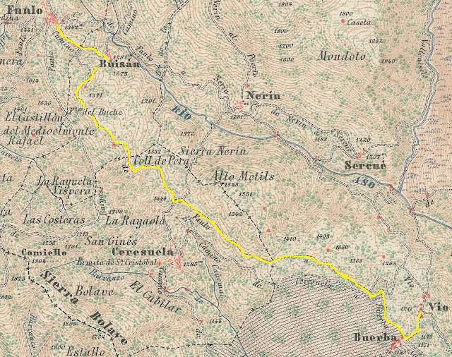 Se propone recorrer el tramo del sendero señalizado GR 15.1 desde Vió a Fanlopasando por Buerba y Buisán. Este camino coincide con el tradicional que unían estos pueblos, como podemos verlo señalado sobre un mapa de 1931.