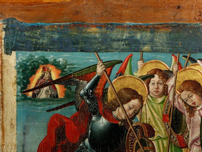 En la parte superior, se adivina la figura de San Miguel pesando las almas con su balanza y un peludo demonio intentando desequilibrarla a su favor.