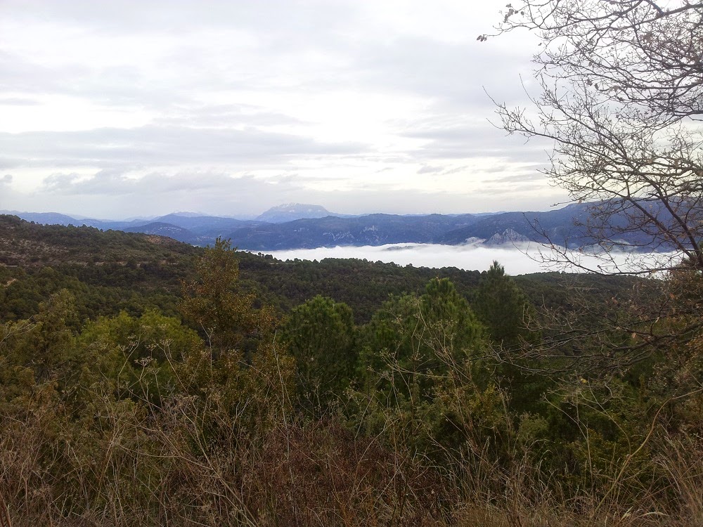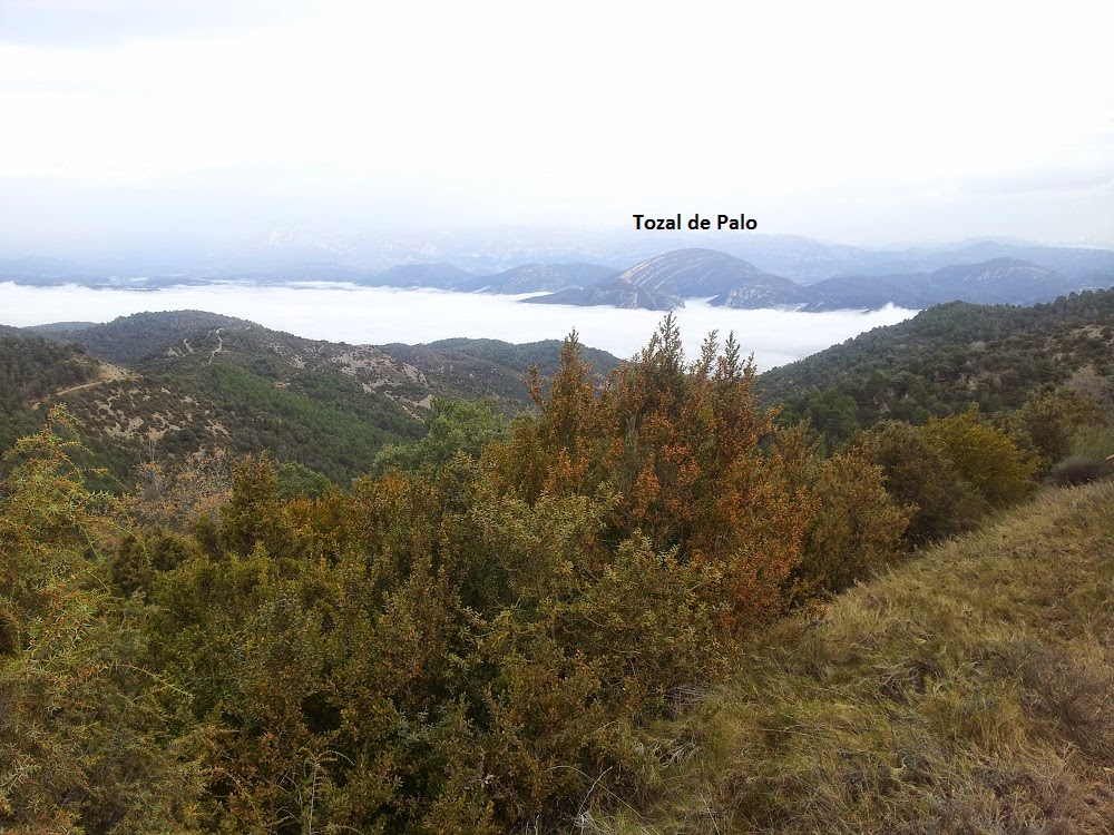 Vamos subiendo por la pista (ha sido realizada para posibilitar el acceso al bosque y a los cortafuegos) que nos permite ver Naval hasta que llegamos en el kilómetro 6,6 junto al Pico del Pino donde cambiamos de vertiente en el Barranco de la Trinidad y ver el paisaje del Sobrarbe. Aunque hoy la niebla sólo nos deja ver los montes más cercanos, como es el caso del anticlinal del Tozal de Palo.