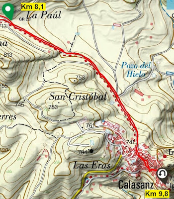 Quedan dos kilómetros para llegar a Calasanz en el kilómetro 9,8. Antes de llegar nos encontramos el pozo de hielo y las salinas.